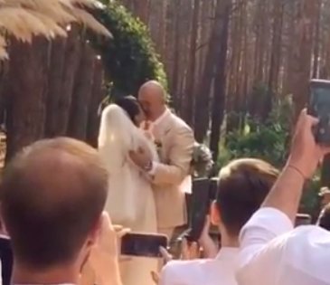 У мережу потрапило відео з урочистого обміну обручками у альтаря, на якому Потап пристрасно цілує і обіймає свою дружину. Потім він бере щасливу дівчину на руки й несе у захоплений натовп.