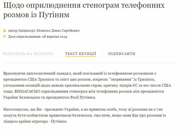 Відповідна петиція з’явилася на сайті президента під номером № 22/074726-еп. Автор петиції наголошує, що президент України – публічна особа, тому ці розмови повинні бути оприлюдненими, особливо, якщо мова йде про розмову з лідером країни-агресора.