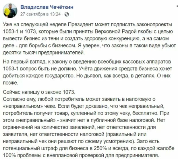 По его словам, законопроекты №1053-1 и №1073, которые Верховная Рада приняла с целью вывести бизнес из тени и создать здоровую конкуренцию, на самом деле уничтожит средний бизнес целиком и полностью.