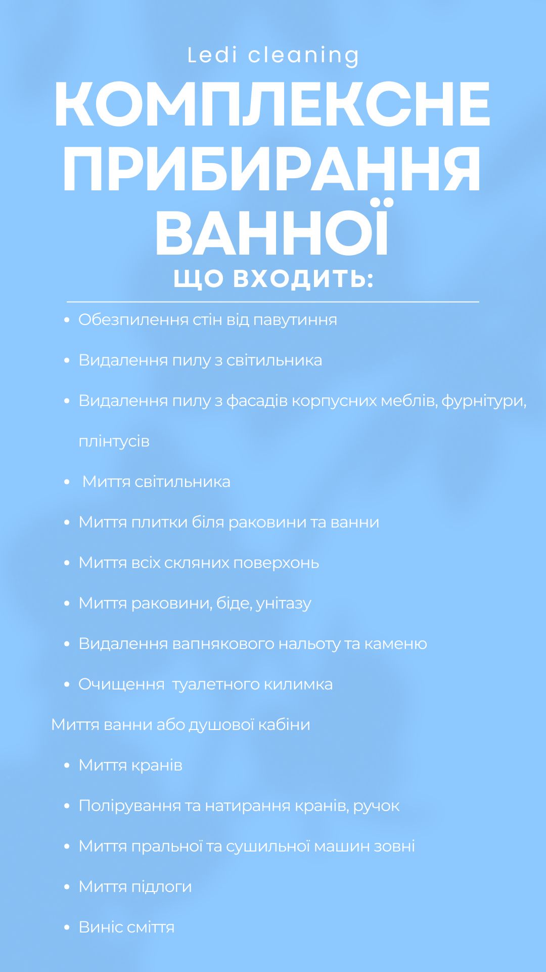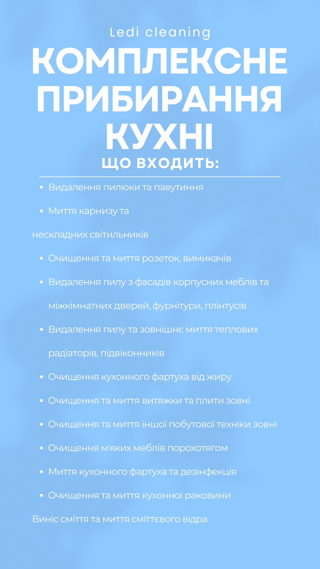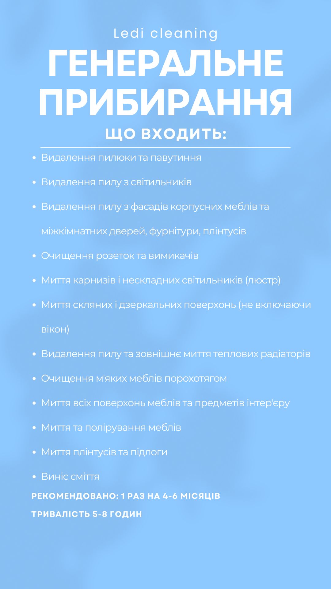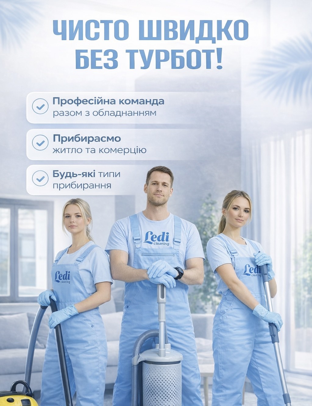 Клінінгова компанія «Леді» надає широкий спектр послуг та допоможе створити чистоту й порядок у приміщенні. Приберемо все до останньої пилинки