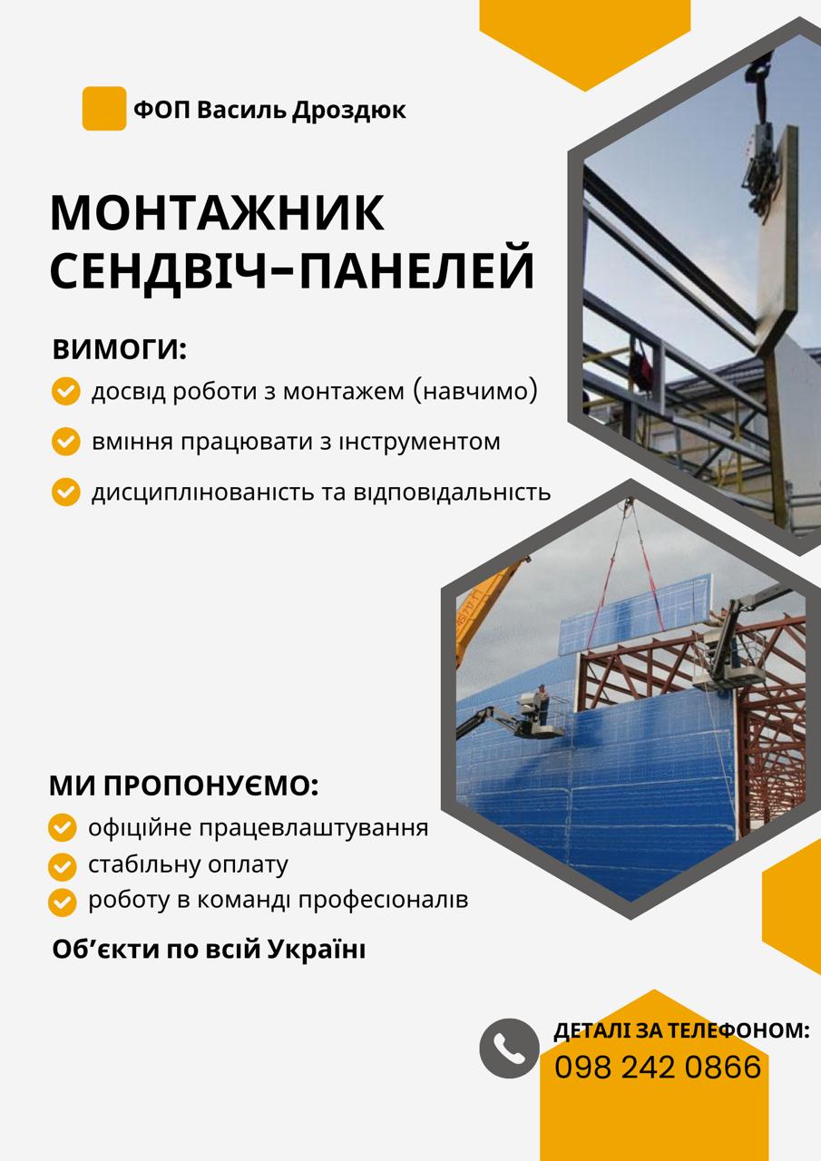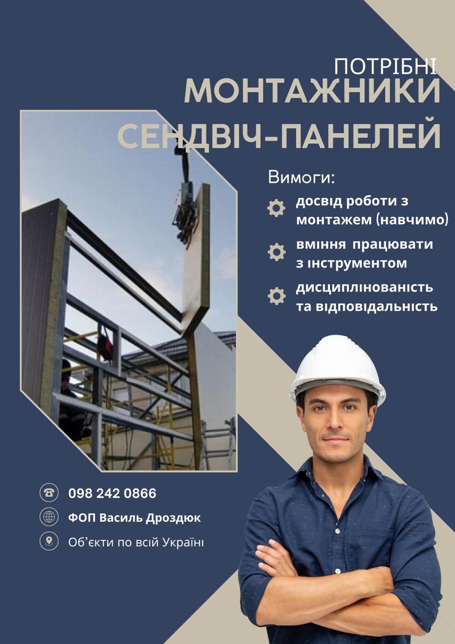 Шукаємо відповідальних та дисциплінованих людей на вакансію монтажник сендвіч-панелей
